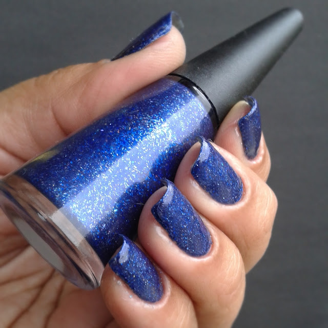 Nela tem: glitter fininho azul e preto, glitter holográfico, esmalte azul e base de suspensão.